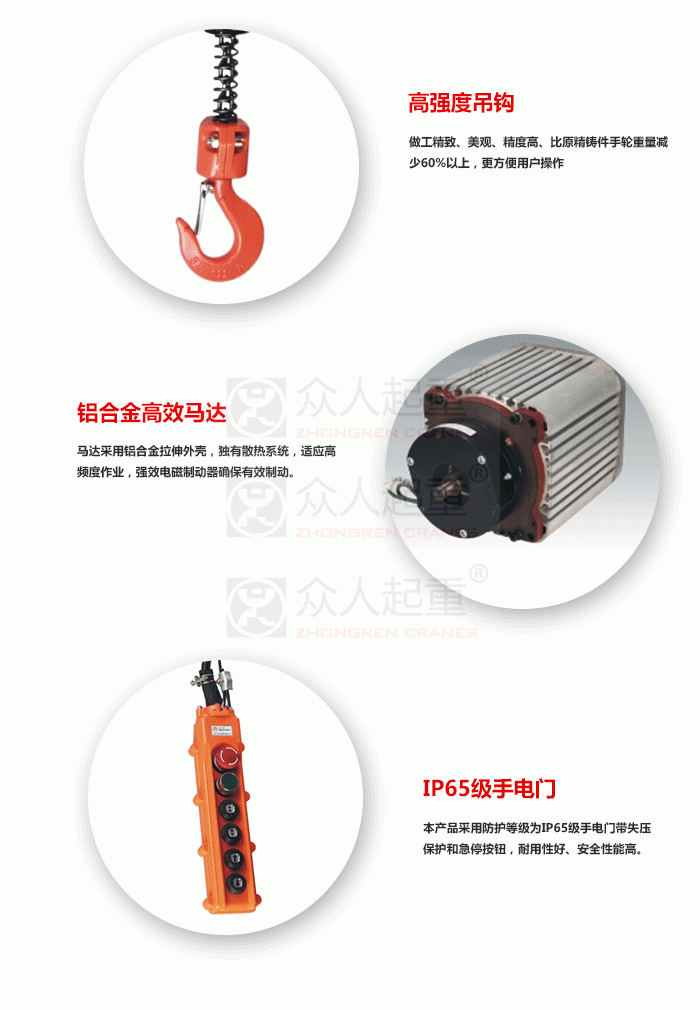 1、高效、質輕電機,無石棉剎車系統,低能耗。 2、沖壓鋼構殼體,輕巧而堅固。 3、高強度安全吊鉤,承受意外超負荷沖擊不會發(fā)生斷裂,只是逐漸變形。 4、輕巧、美觀而耐用的塑制鏈袋。 5、極限開關:吊上吊下都有極限快關裝置,使電機自動停止,反防止鏈條超出,確保安全。 6、逆相保護裝置:特殊電線裝置,當電源接線錯誤時,控制電路無法動作。 1.要保持連續(xù)和令人滿意的操作,必須實施定期項目檢查規(guī)程,更換磨損或損壞的零部件,以使其不成為非安全操作的隱患。 2.項目檢查間隔依葫蘆使用情況而定,并基于所使用的葫蘆類型以及重要零部件的磨損程度、老化和故障程度來確定項目檢查間隔。 3.不要使用處于維修狀態(tài)的葫蘆。 4.不要在吊有載荷的情況下儲藏葫蘆。 5.擦除葫蘆上的污漬。 6.在干燥清潔的場所儲藏葫蘆。 7.起重鏈條爆裂可能導致人員傷亡或嚴重傷害,應仔細維護起重鏈條,包括正確操作,良好的維護和檢修。 8.應確保對起重鏈條,吊銷、上鉤軸、吊鉤頸部等零部件的潤滑。 9.應確保用于黃油相同的機械油對起重鏈條加以良好潤滑。 操作前注意事項: 1.如產品的吊鉤和吊耳發(fā)生變形或裂痕,請勿使用。 2.操作前,應確保實施過項目檢查分類中的所有內容。 3.對提升或拉緊物需進行質量估算,再選用合適的起重葫蘆。 4.檢查上吊鉤銷軸和下吊鉤確保有無變形或松動。 5.手動檢查限位開關工作是否正常。 6.鏈條扭絞、打結、雙行鏈條下吊鉤翻轉均勿開機起吊。 7.電動葫蘆必須在可靠接地的前提下投入使用。 8.起重鏈條是特殊合金鋼制作并經過熱處理,不能私自進行焊接或改裝。 9.請在負載使用前給減速器加注0.7KG L-CKD100閉式齒輪油,在鏈條表面涂刷L-CKD100號齒輪油或鈣基潤滑脂。 10.裝配在葫蘆里的鏈條不可修理。 11.在溫度低于0°時確保制動器沒有結冰。 操作中注意事項: 1.勿使用帶有變形或有裂痕的起重鏈條的葫蘆。 2.勿將起重鏈條作為重載索具使用。 3.勿將該葫蘆用于斜吊垂直方向>12°的重物。 4.勿將重物直接掛于吊鉤尖端上支承。 5.勿將鏈條在阻礙物(如鋼板)表面通過。 6.勿在懸吊的重物上面實施焊接或切割操作。 7.勿搖動提升貨物。 8.勿使用已損壞或使用時有異常聲音的葫蘆。 9.勿起吊時作急速上、下的重復操作。 10.勿將提升的重物擱置,長時間無人監(jiān)管。 11.應確保重載正確置于吊鉤鉤腔部位。 12.實施提升重物前,應確保消除起重鏈條間隙,以避免發(fā)生沖擊負載現象。 操作完畢注意事項: 1.操作之后應確保將重物安全的降落下來,以避免重物掉落。 2.操作完畢后及時按下手電門總停按鈕,避免他人誤操作。 其他注意事項: 1.在特殊環(huán)境條件下使用時(如鹽水、海水、酸性物質、堿性物質或易爆環(huán)境),請?zhí)崆芭c你的經銷商或本公司聯系予以確認。 2.勿使用發(fā)生故障或維修狀態(tài)下的葫蘆。 |